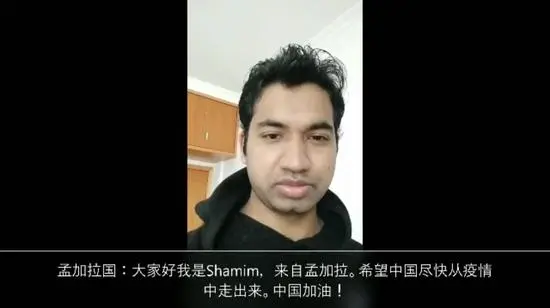 來(lái)自孟加拉國(guó)的Shamim,在浙江湖州留學(xué)和實(shí)習(xí)近一年了。對(duì)于中國(guó)奮力抗擊疫情的表現(xiàn),他深受感動(dòng)。日前,Shamim聯(lián)系了意大利、哈薩克斯坦、南非等12個(gè)國(guó)家的朋友,邀請(qǐng)他們一起錄制了一段視頻,鼓勵(lì)中國(guó)朋友們繼續(xù)堅(jiān)持,戰(zhàn)勝疫情。“相信中國(guó)的朋友,看到這段視頻,會(huì)很高興。我們和他們一起加油!”他說(shuō)。
